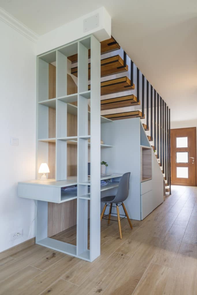 Le bureau intégré s’insère parfaitement sous la première volée de marches, créant une surface de travail fonctionnelle et épurée, complétée par des rangements discrets en partie basse.